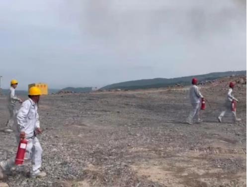 此次演練,災情設(shè)定挖掘機在進行焊接作業(yè)時,焊接火花飛濺引燃一旁維修時使用的擦拭油料的棉紗,由于維修位置靠近清表時砍伐的樹木且臨近礦區(qū)邊緣林區(qū),由于當天風勢較大待發(fā)現(xiàn)時被砍伐的樹木已被引燃且火勢洶涌,發(fā)現(xiàn)火災事故的員工立即通知帶班領(lǐng)導。帶班領(lǐng)導接到報告后,立即啟動應急預案,組織人員進行滅火。