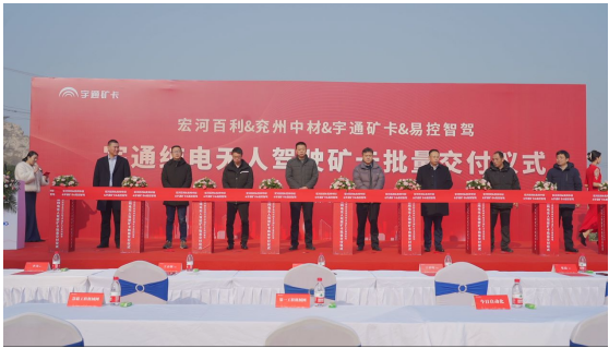 2022年12月28日,宏河百利、兗州中材、宇通礦卡、易控智駕四家企業代表在兗州中材鄒城分公司隆重舉行了純電無人駕駛礦卡批量交付儀式。