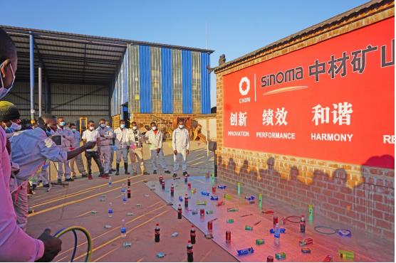 舉行以各生產部門為團隊的拔河比賽,圖片為中方員工組成團隊與贊方員工比賽圖。